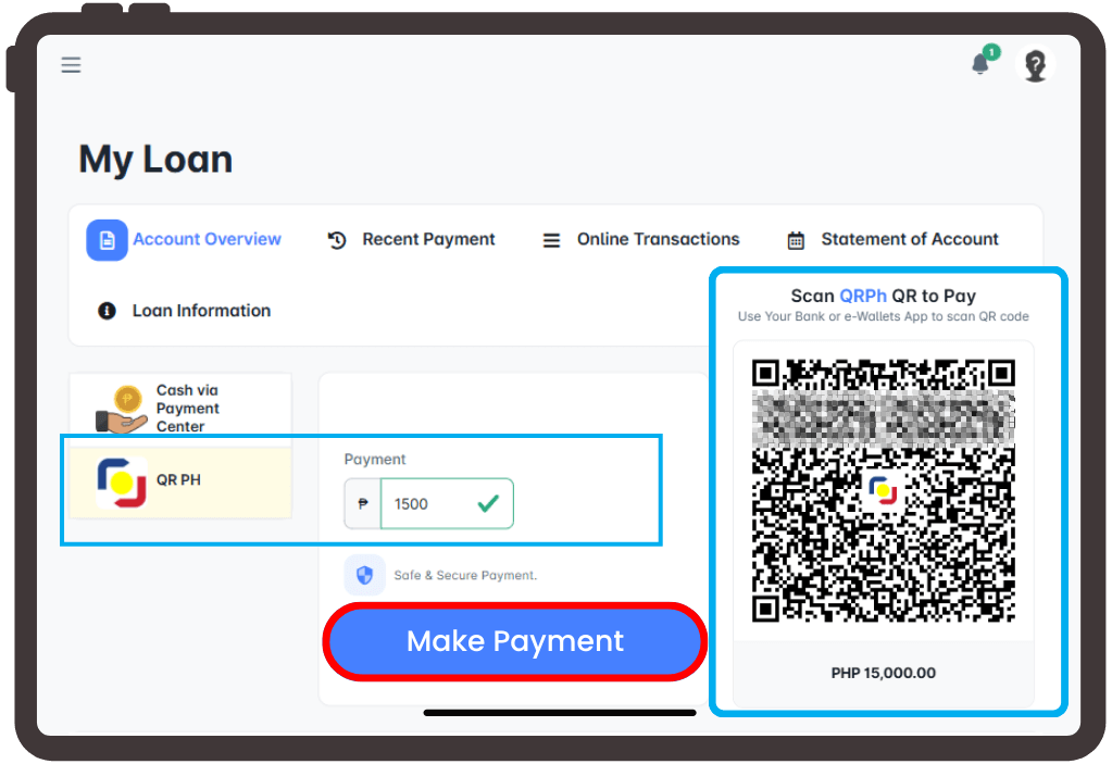 Choose QR Ph as your payment option. Enter your monthly due amount and wait for the system to generate your unique QR code. Take a screenshot or save the code to your phone.