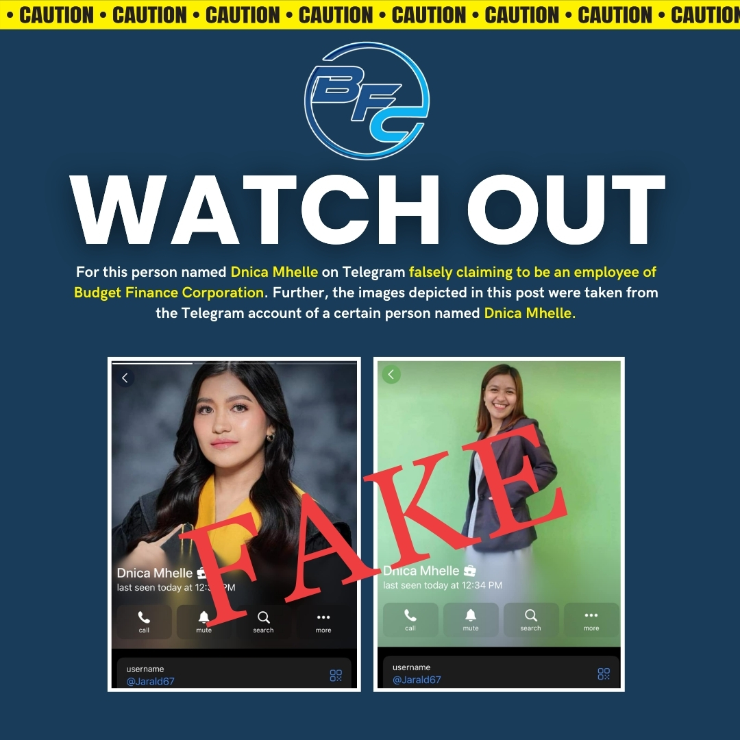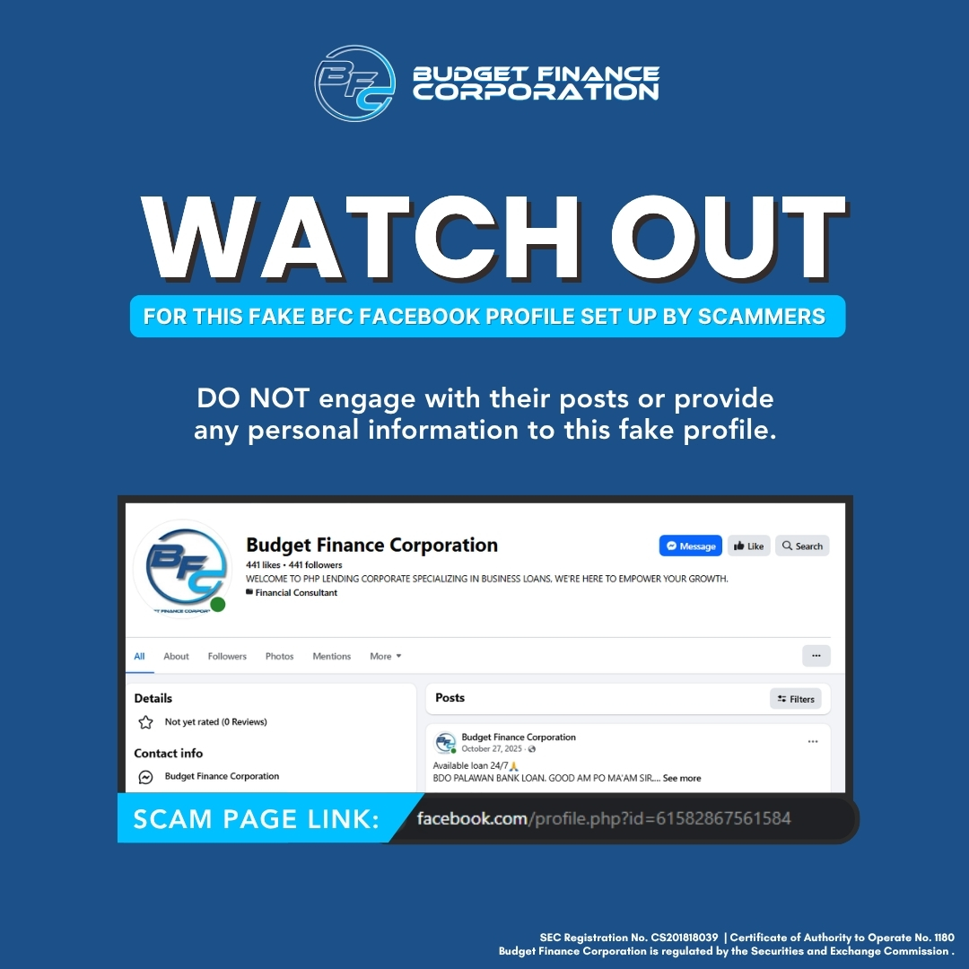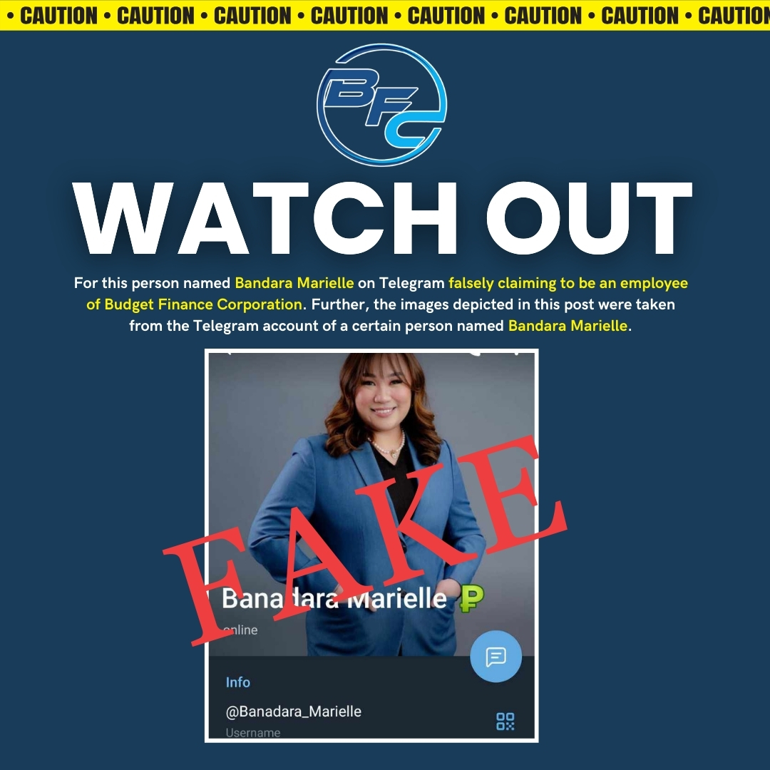 Napag-alaman namin na kumakalat online ang mga nagpapanggap na mga empleyado ng Budget Finance Corporation at nag-aalok ng personal loan nang may hiniginging paunang bayad. Kinukuha ng mga manlolokong ito o “scammer” ang mga larawan at personal na detalye ng aming mga empleyado sa Facebook upang gumuwa ng kanilang sariling mga Facebook o Telegram account para imessage ang aming mga kliyente o bitkima, lalo na ang mga OFWs na kasalukuyang nagtatrabaho sa ibang bansa. Ang ganitong uri ng modus ay tinatawag na "advance-fee" scam.