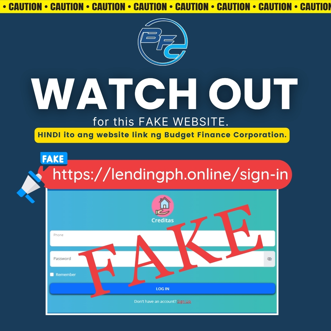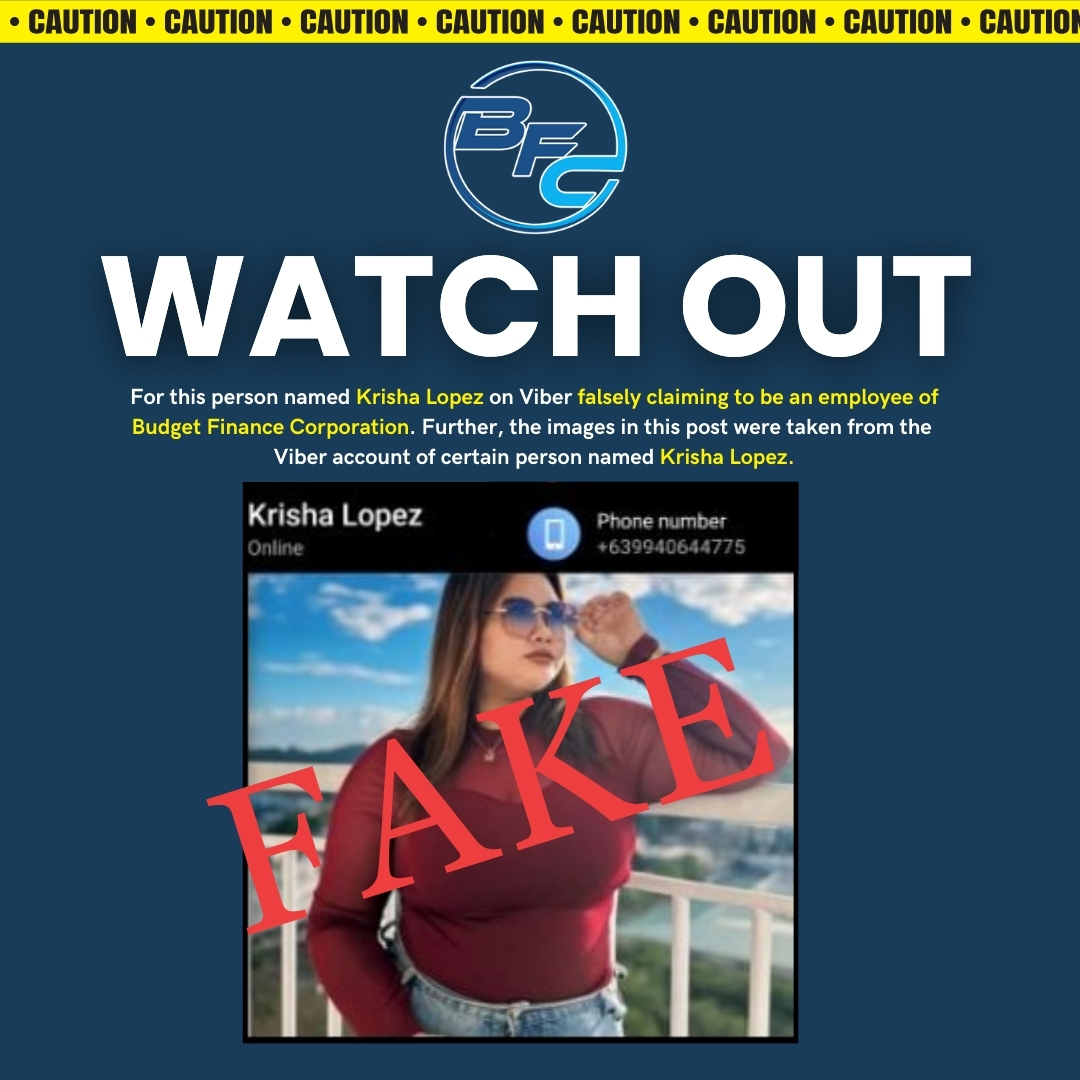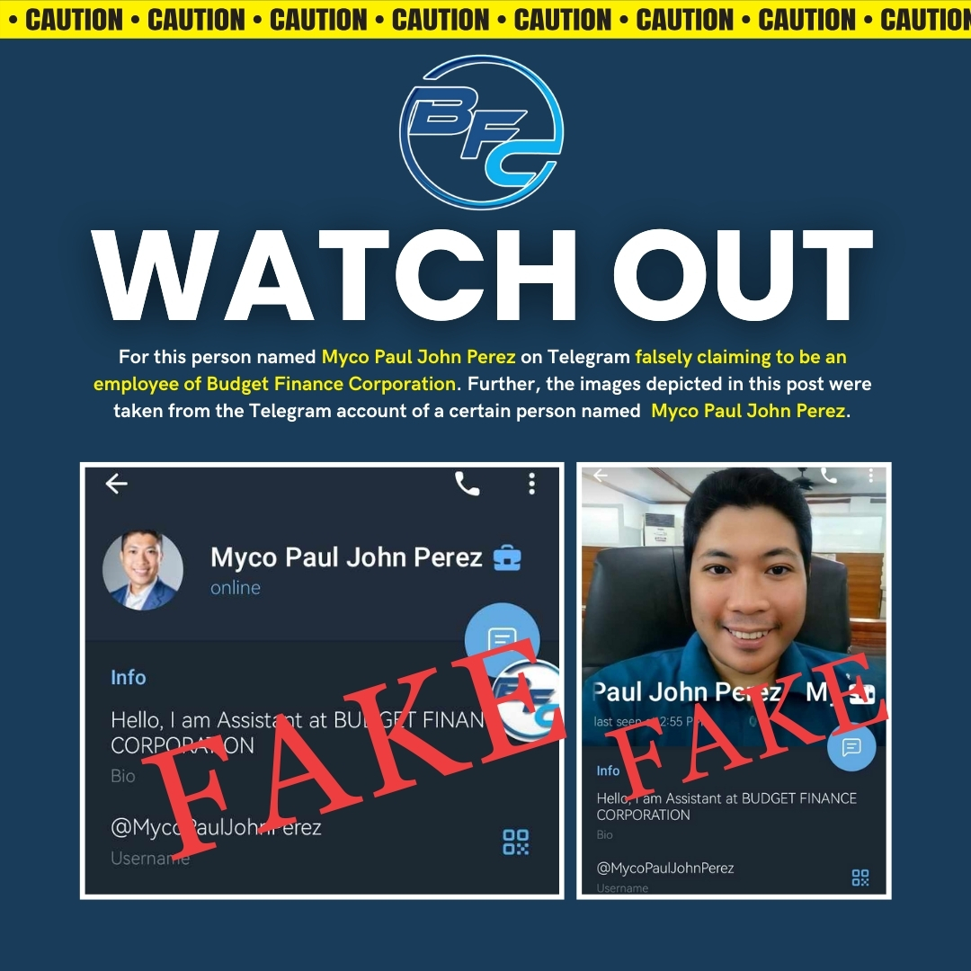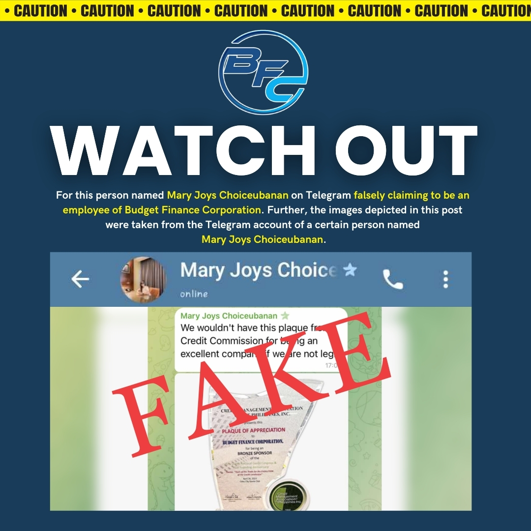 Napag-alaman namin na kumakalat online ang mga nagpapanggap na mga empleyado ng Budget Finance Corporation at nag-aalok ng personal loan nang may hiniginging paunang bayad. Kinukuha ng mga manlolokong ito o “scammer” ang mga larawan at personal na detalye ng aming mga empleyado sa Facebook upang gumuwa ng kanilang sariling mga Facebook o Telegram account para imessage ang aming mga kliyente o bitkima, lalo na ang mga OFWs na kasalukuyang nagtatrabaho sa ibang bansa. Ang ganitong uri ng modus ay tinatawag na "advance-fee" scam.