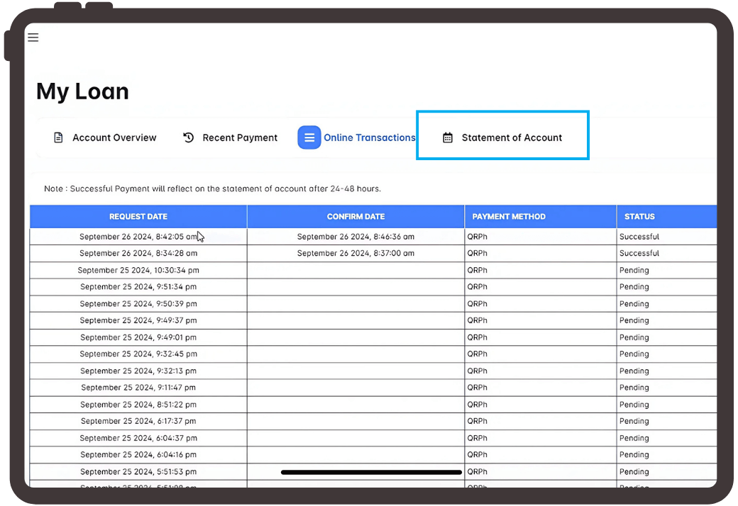 Review the details to ensure everything is correct, then tap Confirm. You’ll receive a confirmation from your app right away. Payments are posted to your Statement of Account within 24–48 hours.